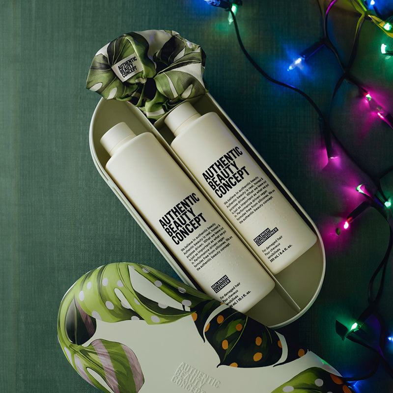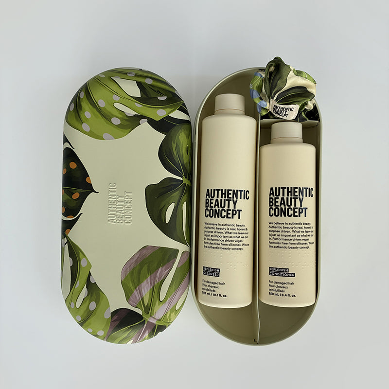 Authentic Beauty Concept | Replenish Cleanser 300ml, Replenish Conditioner 250ml, Scrunchie im WOUF-Design, elegente TinBox mit lebhaftem WOUF-Design