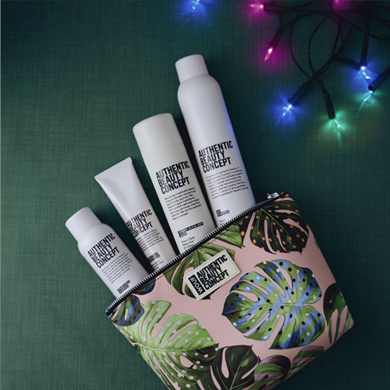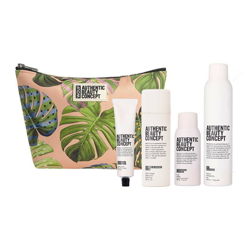 Authentic Beauty Concept | Dry Shampoo 250ml, Cosmic Blow Dry Jelly 150ml, Strong Hold Hairspray 100ml, Hand & Hair Light Cream 75ml, WOUF Styling Bag